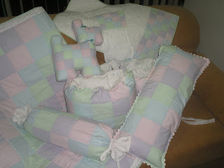 Este foi o primeiro kit berço que fiz. Aprendi em uma de minhas aulas e o vendi para uma grande amiga. Os kits permitem muita imaginação de técnicas, cores, montagem e peças.